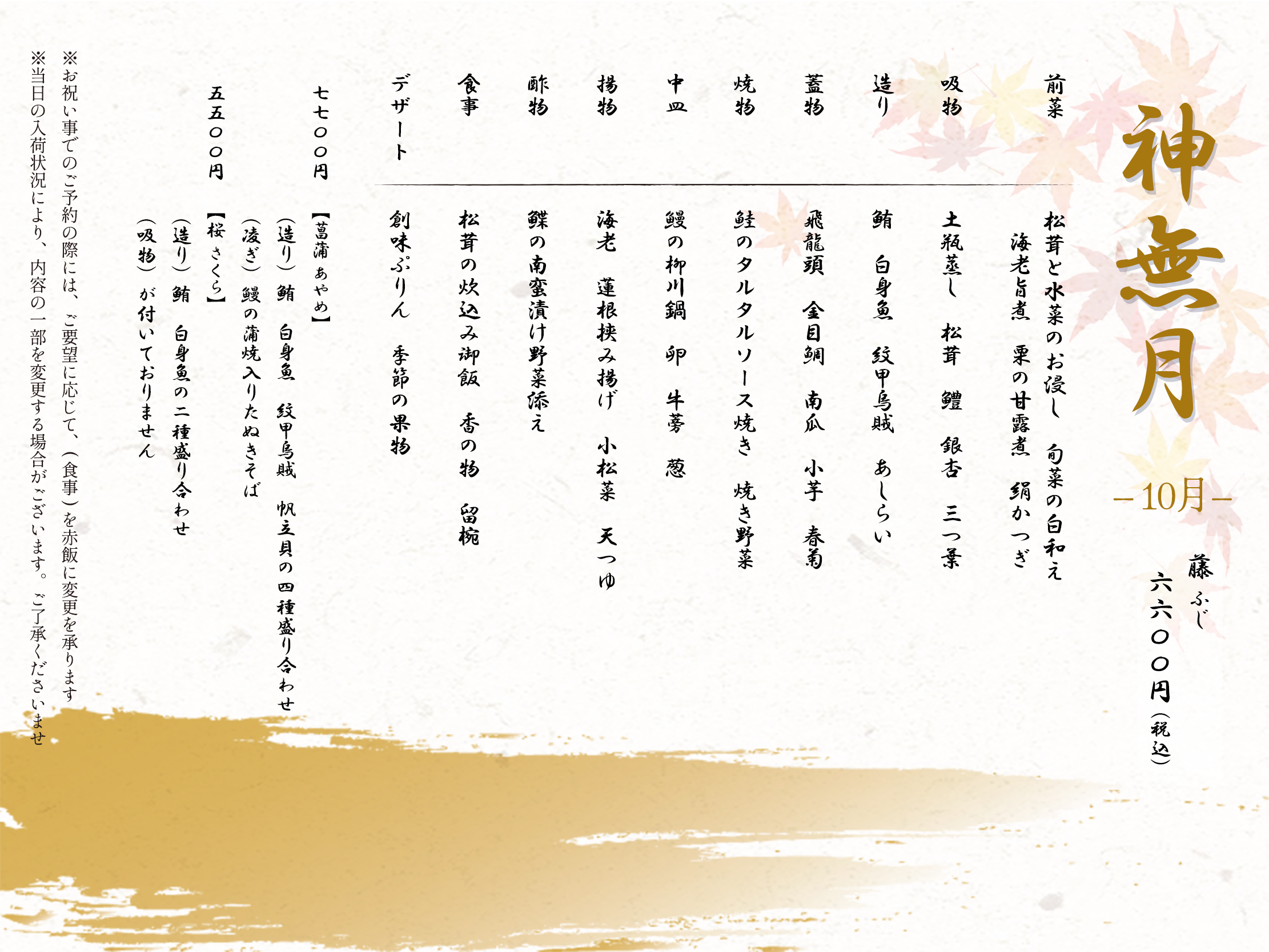 前菜・吸物・造り・凌ぎ・蓋物・中皿・揚物・酢物・食事・デザート