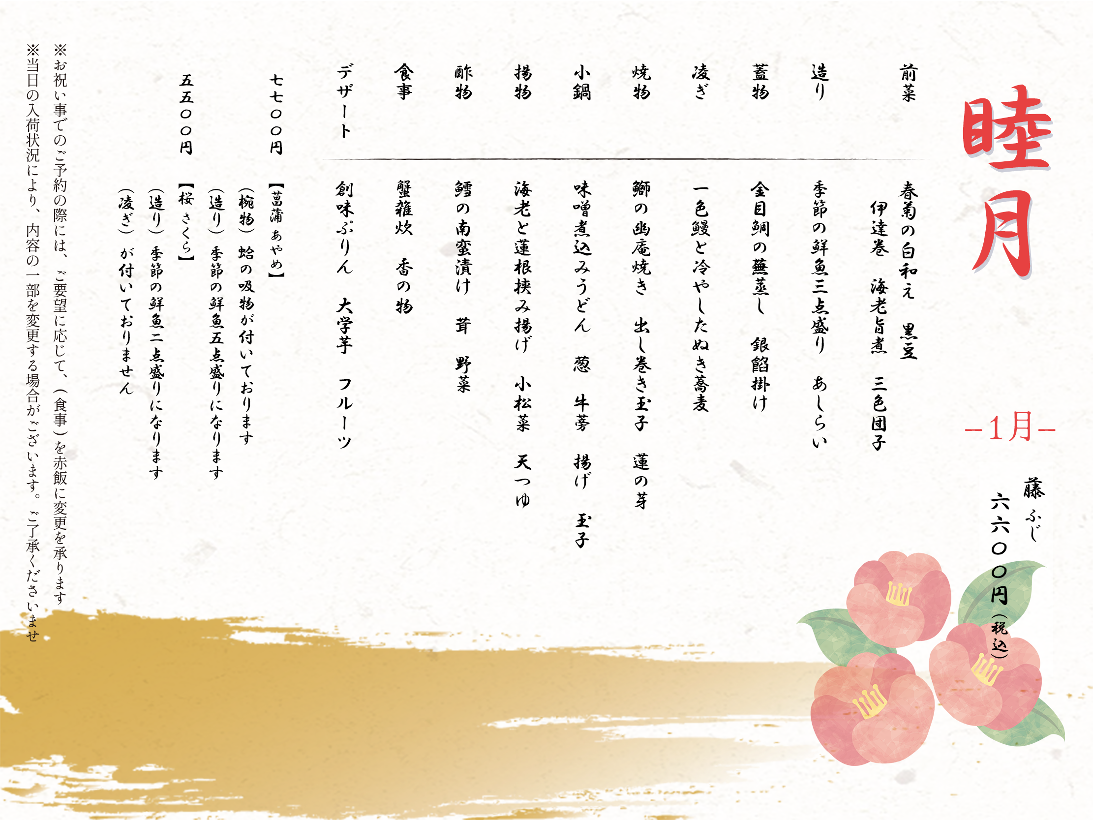 ※お献立は月替わりです※仕入れの状況により、お料理の内容や品数が変わる場合がございます※2日前迄にご予約をお願いいたします